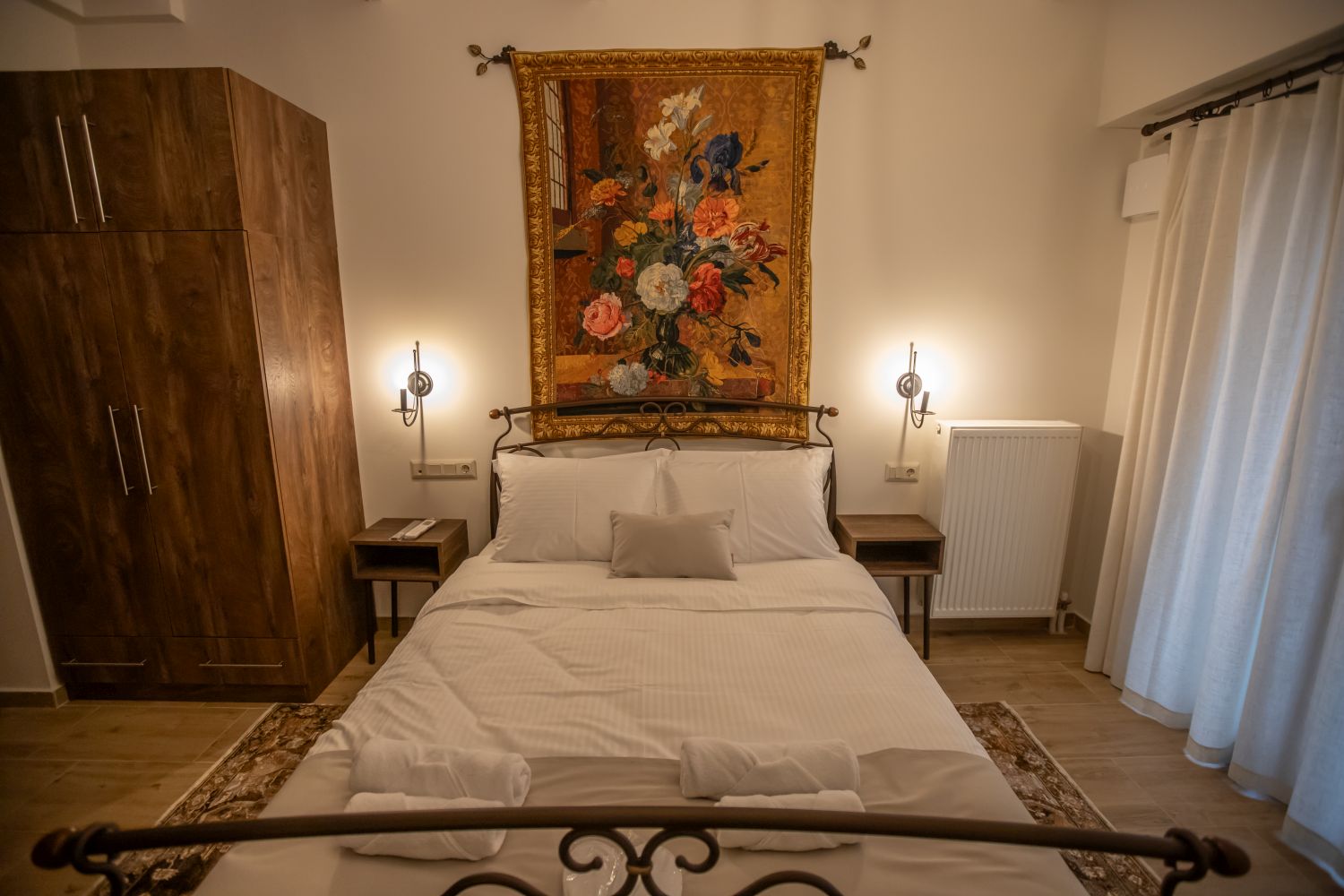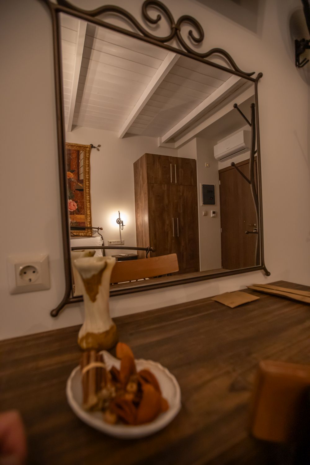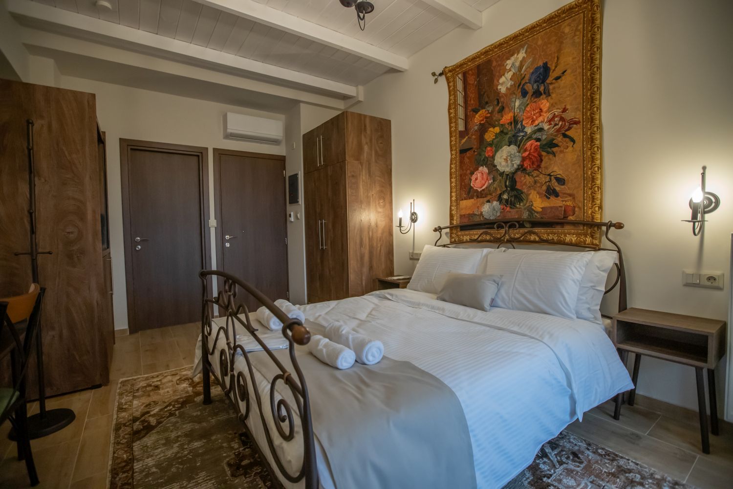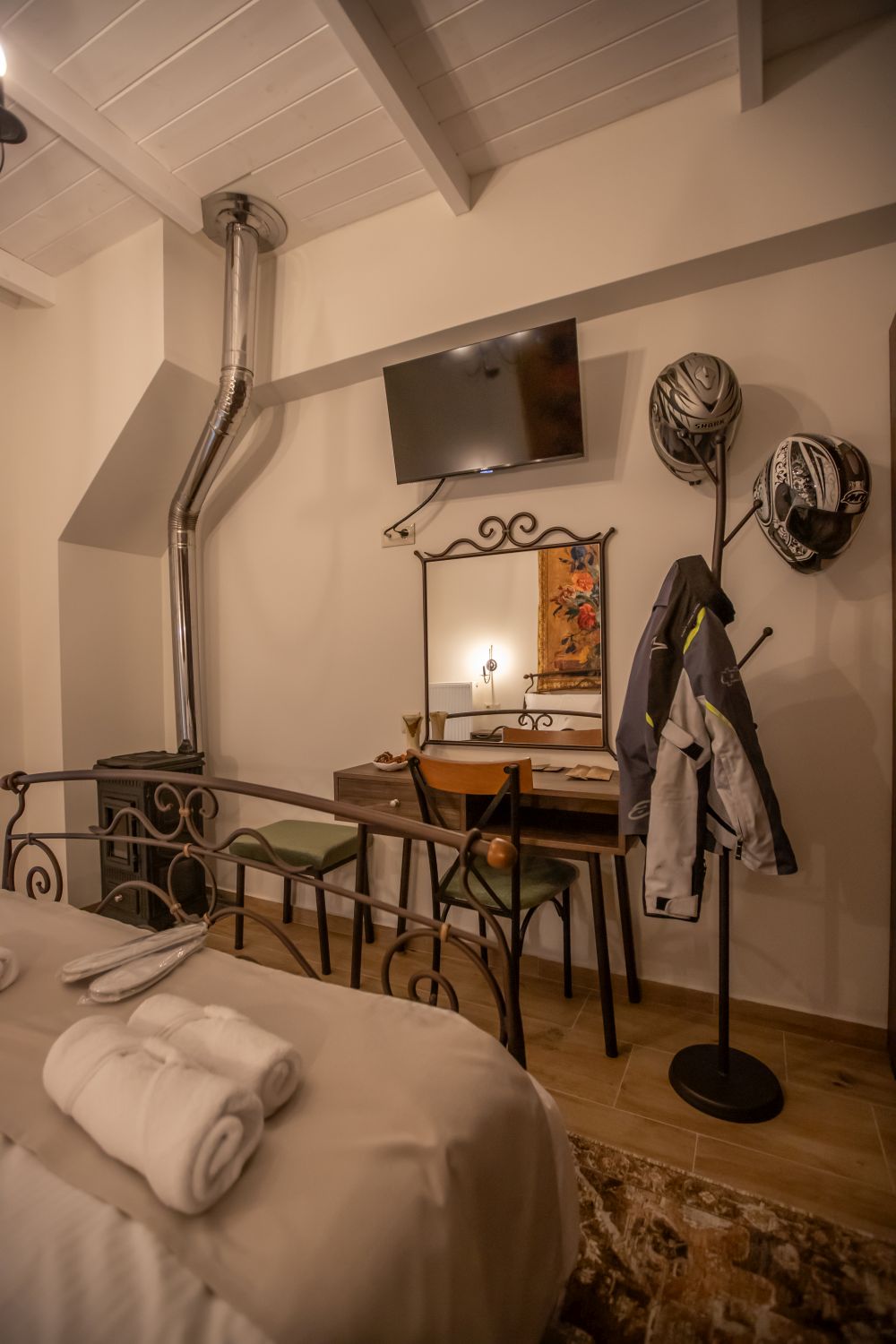 There are special hangers for motorcycle helmets in the room.