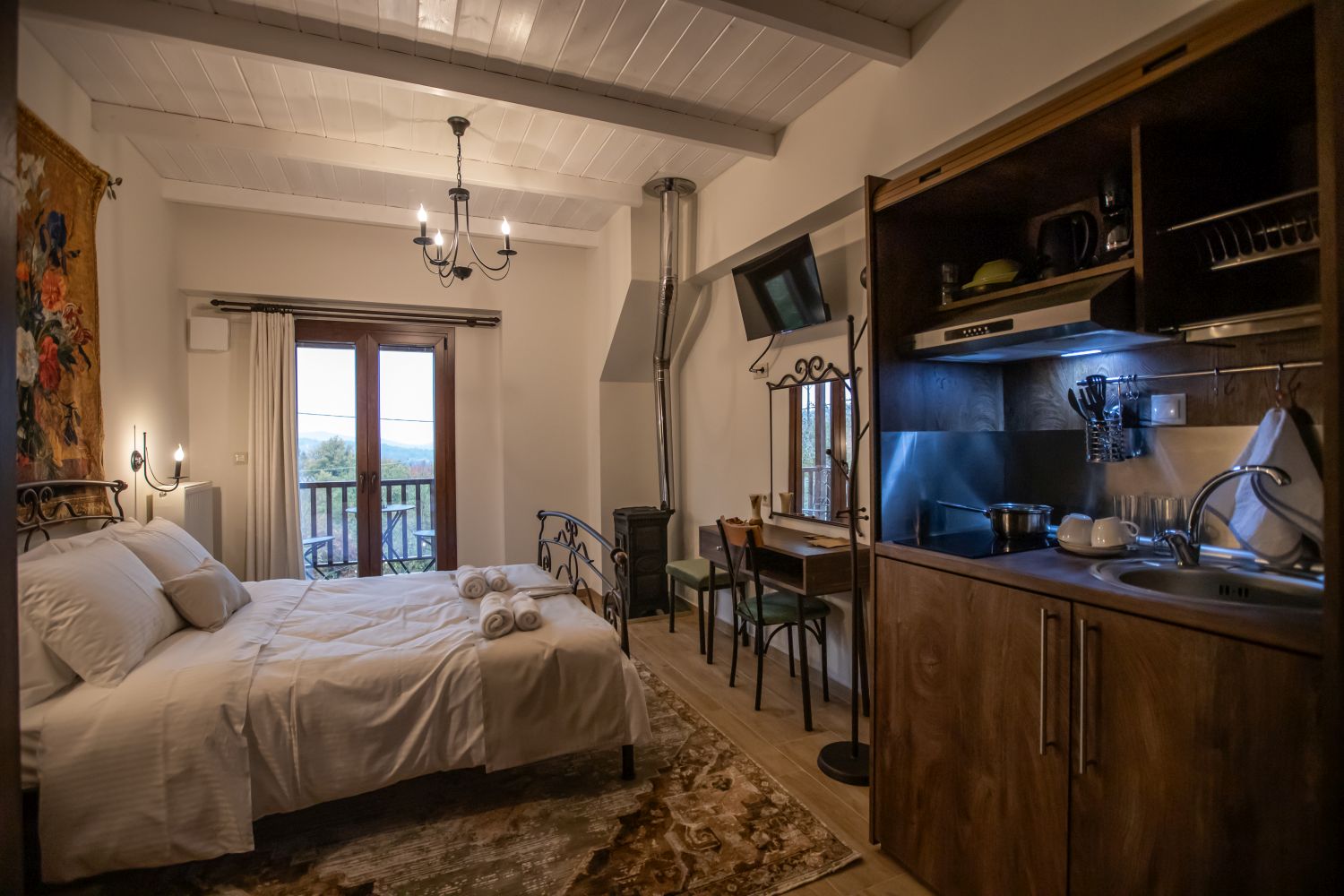 The room has an equipped kitchen with a refrigerator. In the cabinets you will find plates, glasses and cutlery. There is a kettle, a French coffee machine, a pot and pan as well as jars of French coffee, tea and sugar.