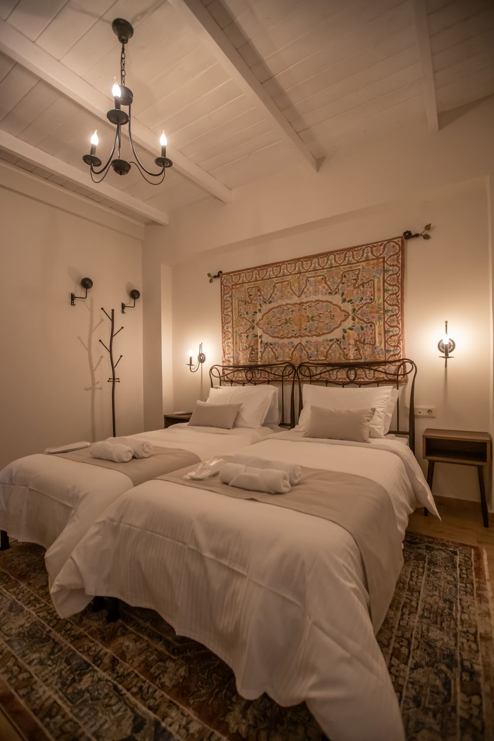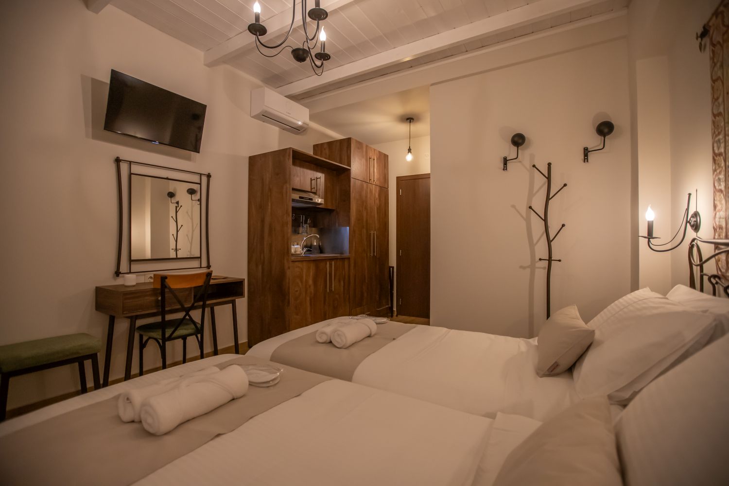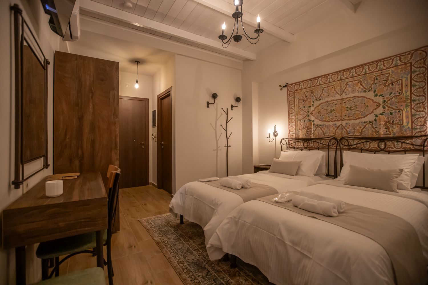 There are special hangers for motorcycle helmets in the room.