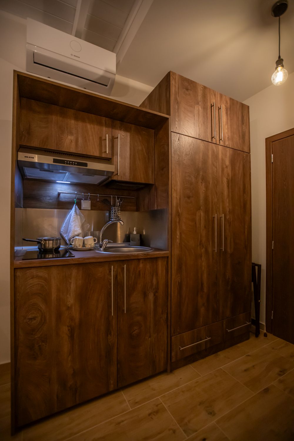 The room has an equipped kitchen with a refrigerator. In the cabinets you will find plates, glasses and cutlery. There is a kettle, a French coffee machine, a pot and pan as well as jars of French coffee, tea and sugar.